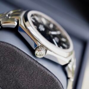 • Mặt số đen đơn giản, cọc số vát nổi, kim to bản – dễ đọc, khỏe khoắn, mà vẫn sang.