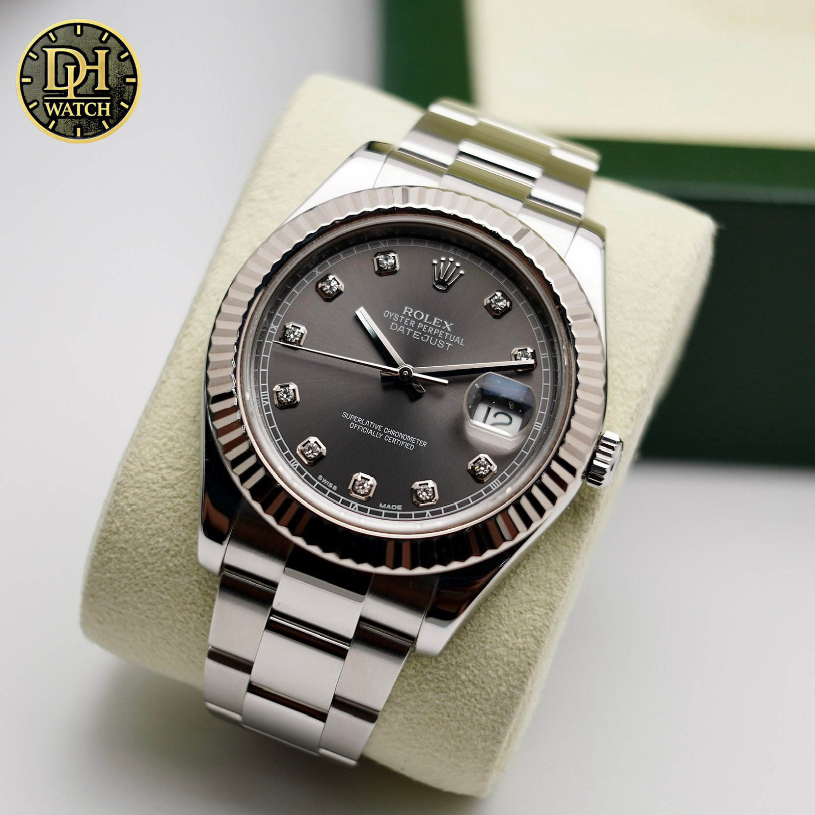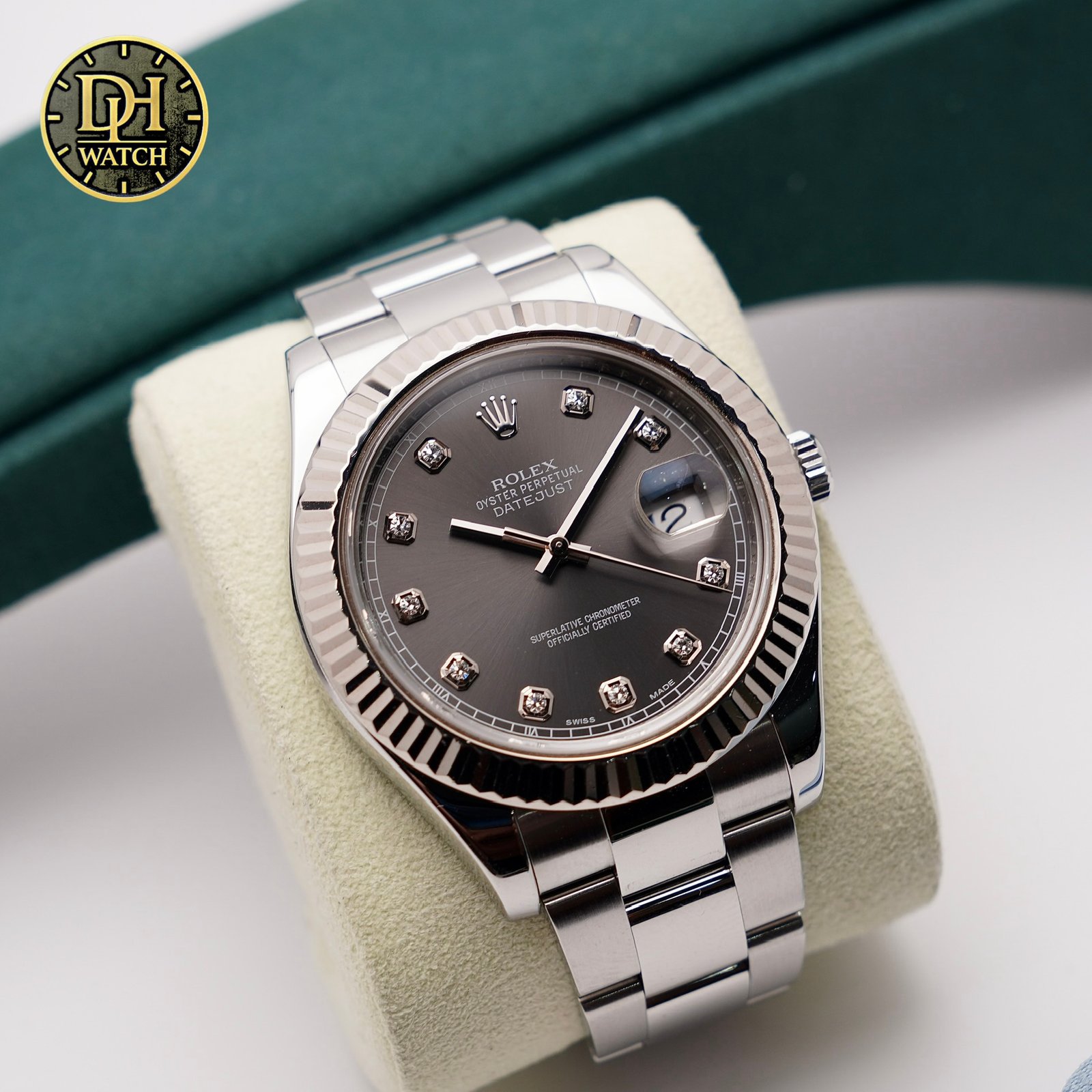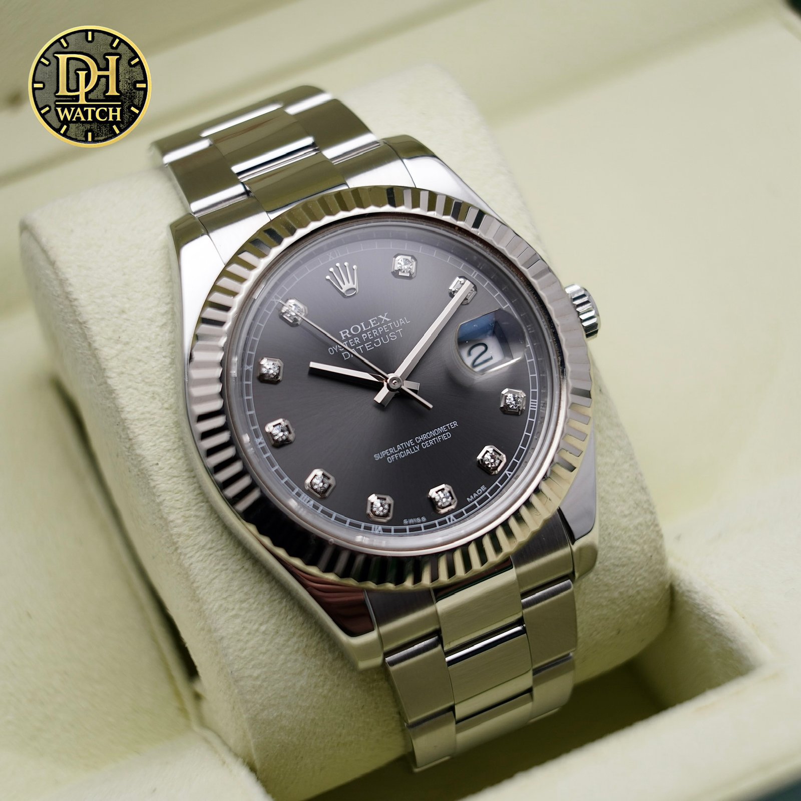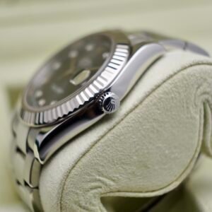 Điểm nhấn nổi bật nhất của mẫu này chính là mặt số rhodium xám ánh tia, kết hợp với các cọc giờ đính kim cương tạo cảm giác cực kỳ cao cấp. Đây là kiểu mặt số rất được giới doanh nhân và người yêu đồng hồ sang trọng ưa chuộng.