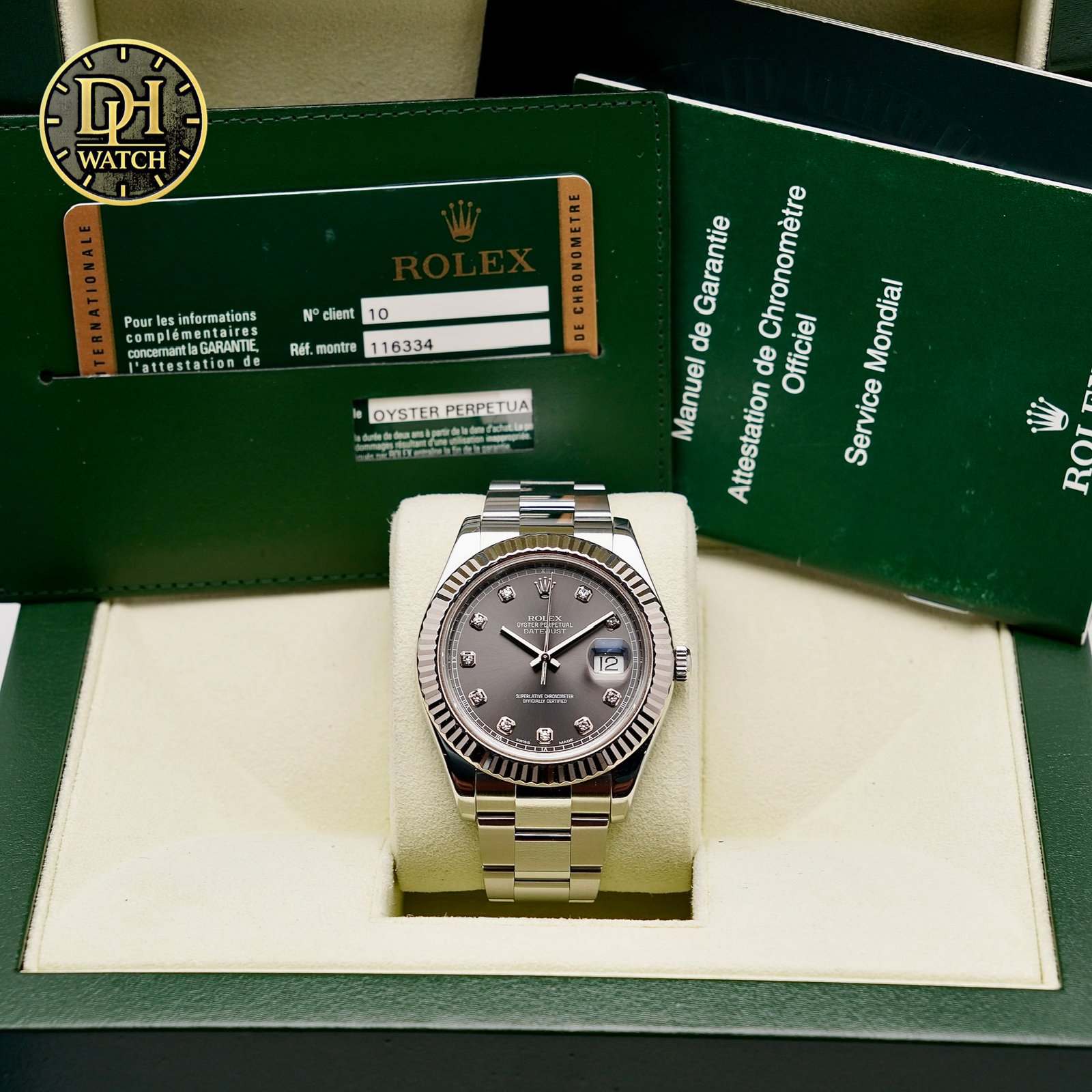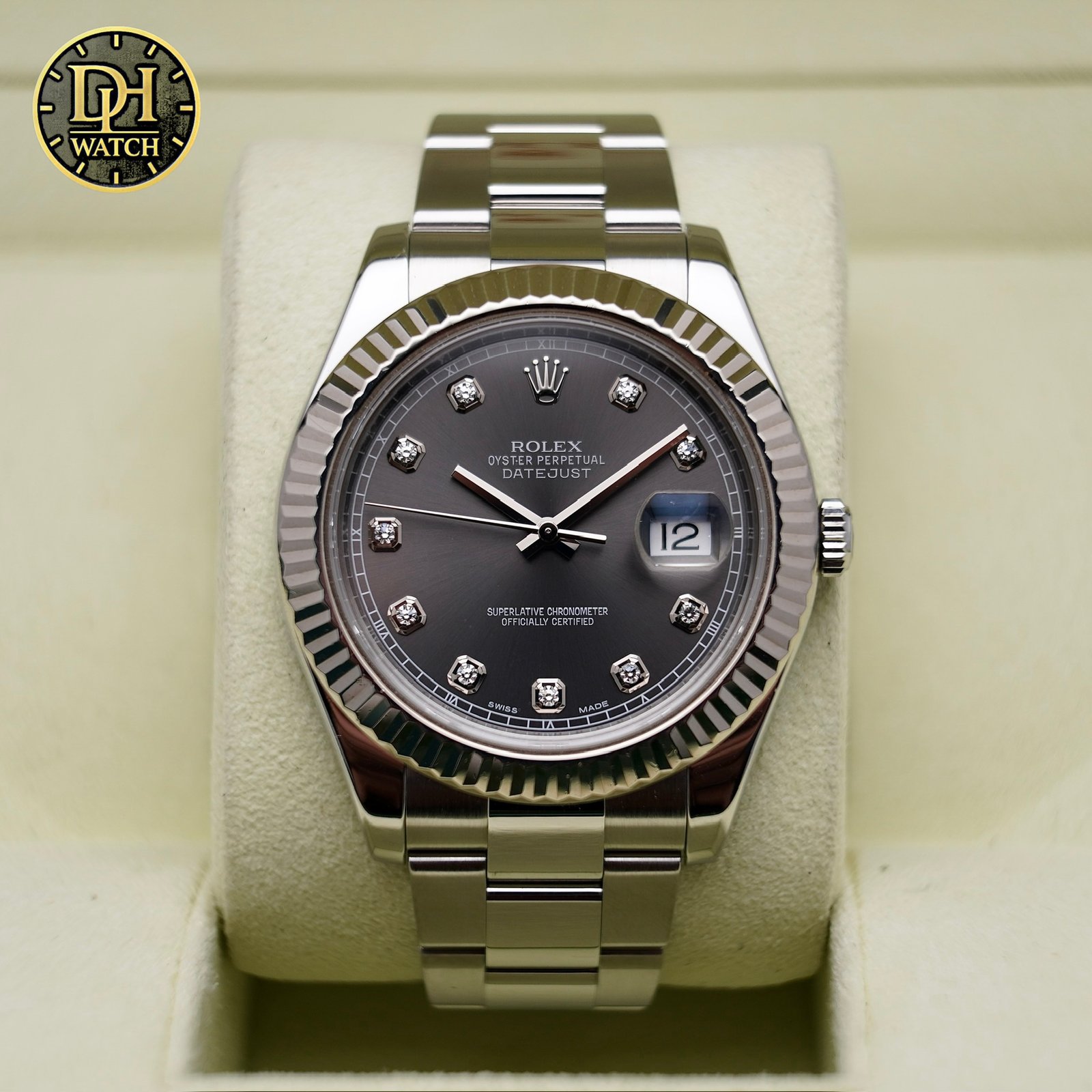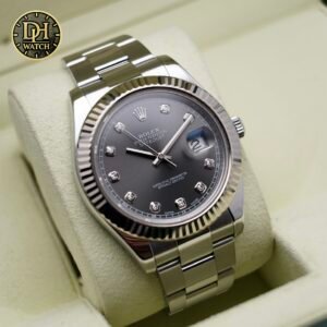 Nếu bạn đang tìm kiếm một chiếc Rolex vừa sang trọng vừa dễ đeo mỗi ngày, Rolex Datejust 41 116334 Rhodium chắc chắn là lựa chọn rất đáng giá. Thiết kế mặt xám rhodium, cọc kim cương, vành fluted và bộ máy Cal.3136 bền bỉ giúp mẫu này luôn giữ được sức hút rất lớn trên thị trường.