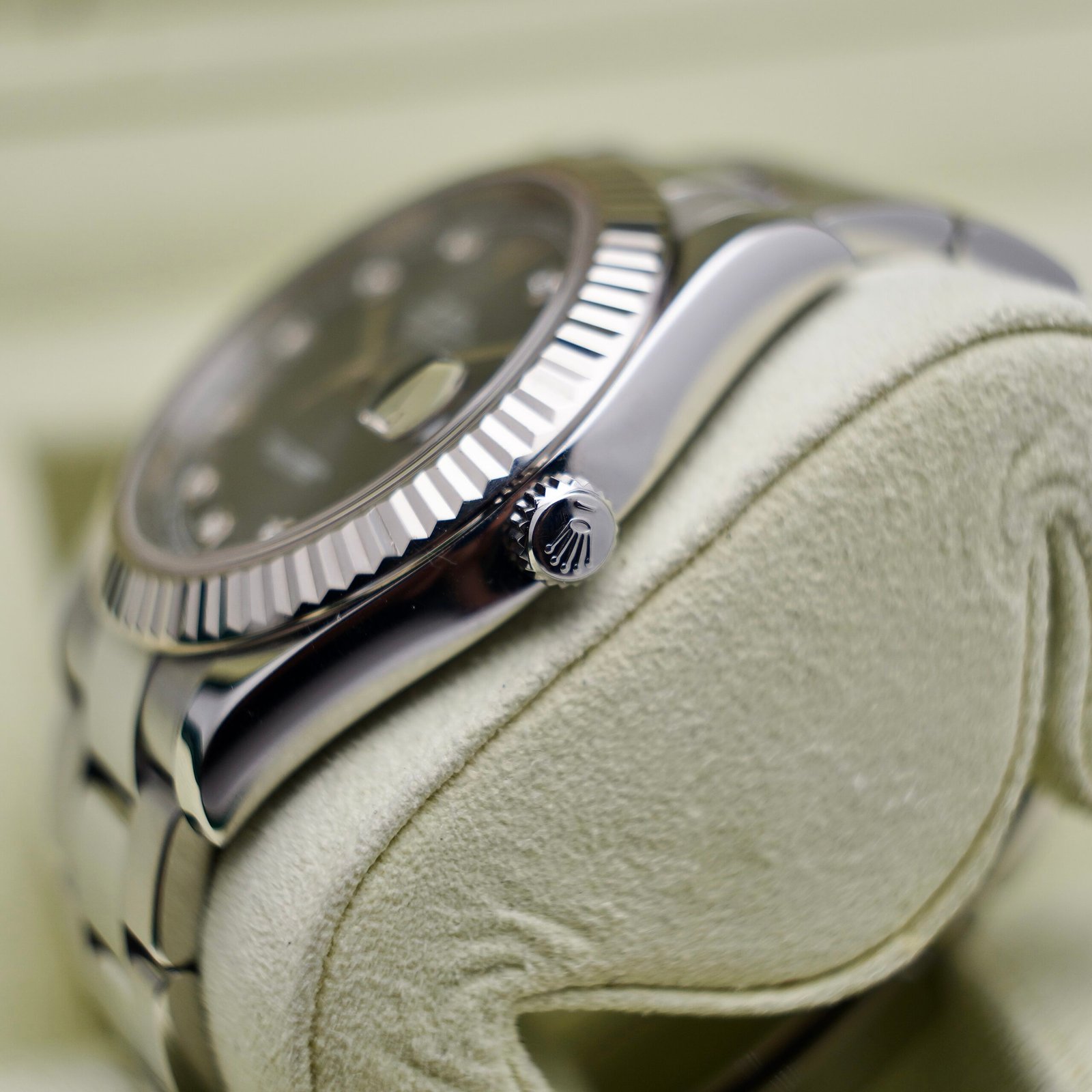 Vành bezel khía fluted bằng vàng trắng là chi tiết không thể thiếu trên dòng Datejust cao cấp, giúp tổng thể chiếc đồng hồ nổi bật hơn hẳn khi đeo thực tế.