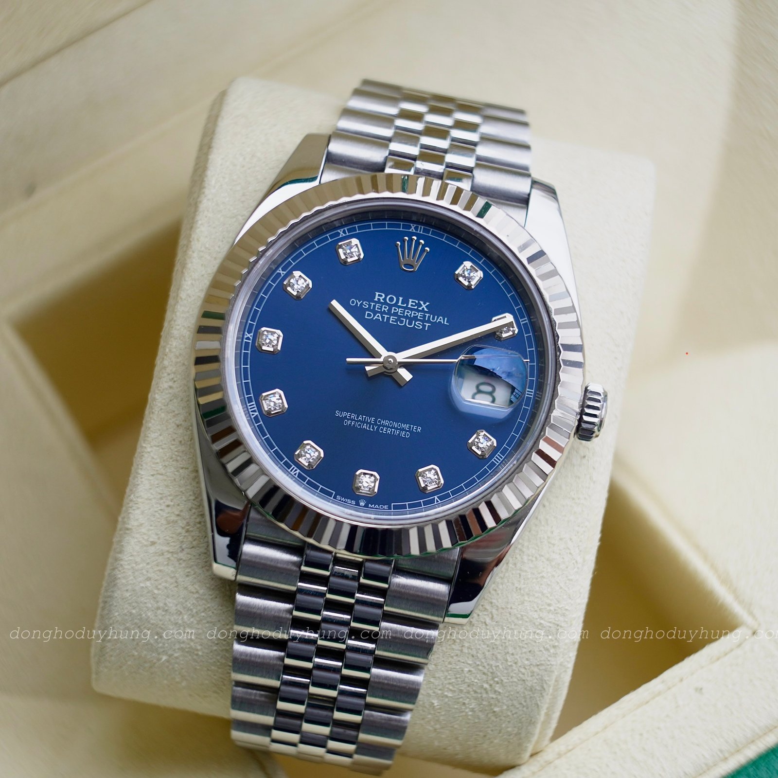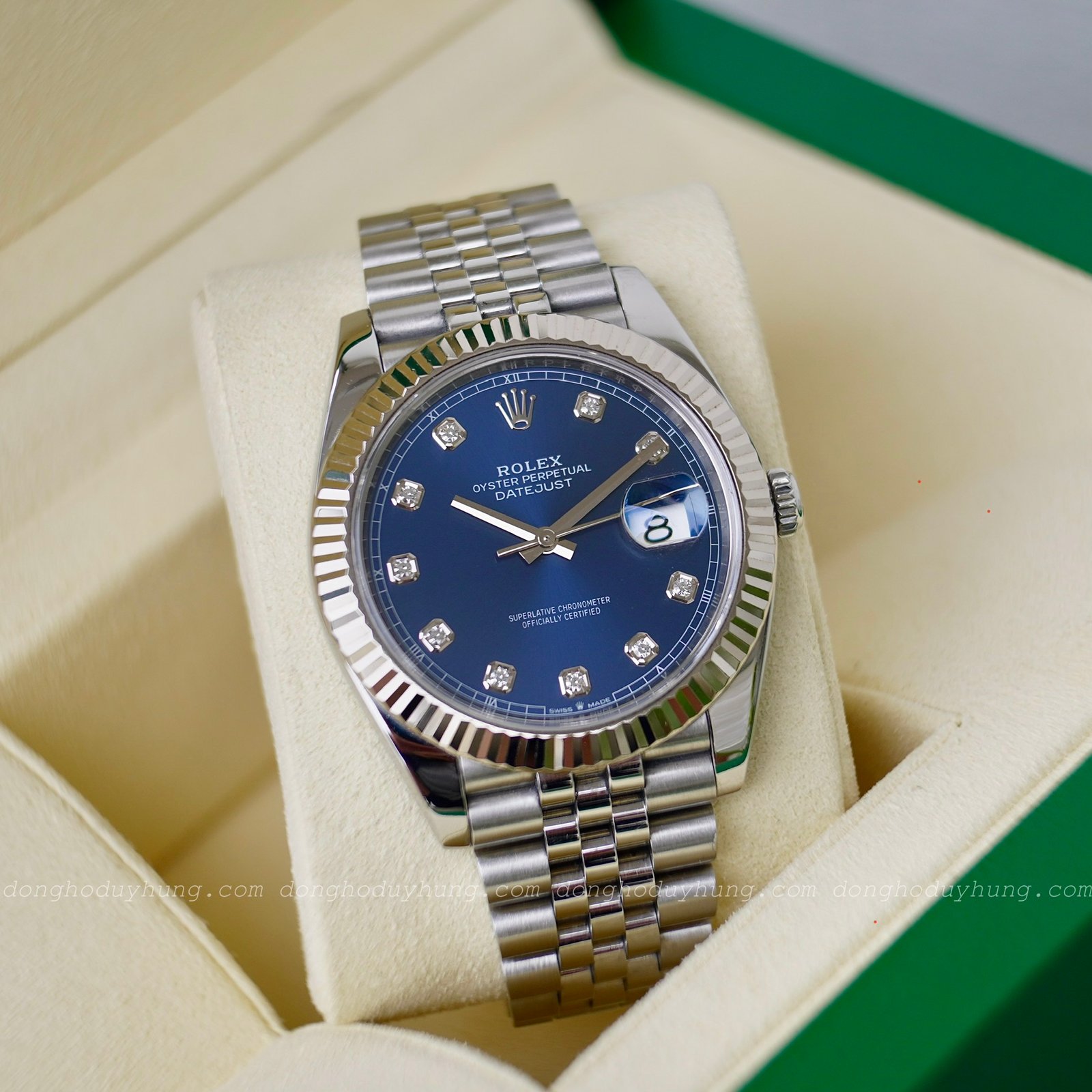 Rolex Datejust 41 ref.126334 là một trong những thiết kế biểu tượng của Rolex, nổi bật bởi vẻ đẹp thanh lịch, tinh tế và phù hợp ở mọi hoàn cảnh. Mặt số Blue Sunburst đổi sắc theo ánh sáng tạo chiều sâu và sang trọng. Cọc số đính kim cương tự nhiên và bộ kim baton mảnh bắt sáng cho khả năng xem giờ rõ ràng hơn.