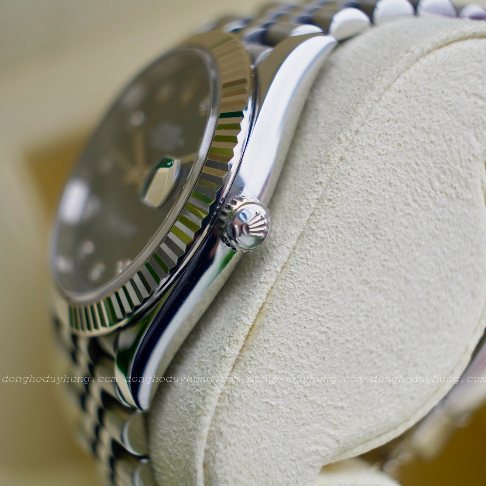 Rolex Datejust 41 với vỏ Oyster bằng thép 904L kết hợp vành khía vàng trắng 18k (White Gold Fluted Bezel) tạo nên vẻ ngoài nổi bật nhưng vẫn tinh tế. Dây Jubilee 5 mối nối ôm cổ tay thoải mái và sang trọng – một điểm nhấn nhận diện đặc trưng của dòng Datejust.
