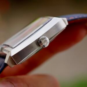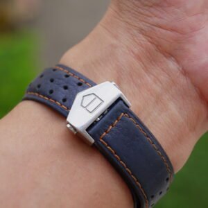 Vỏ thép đánh bóng kết hợp dây da xanh navy khâu chỉ cam nổi bật.