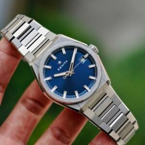 Zenith Defy Classic – Một lựa chọn đậm chất thanh lịch mà không bao giờ tẻ nhạt. – Mang dáng vỏ tonneau tinh xảo, thiết kế liền khối gọn gàng, chất liệu titanium nhẹ nhàng và mặt số xanh sunburst phản chiếu sắc trời. – Sự dứt khoát của bộ kim, cùng ngôi sao năm cánh – biểu tượng lâu đời của Zenith – khiến chiếc đồng hồ này luôn khoác lên mình dáng dấp đương đại.
